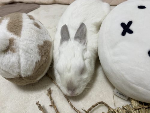 お気に入りのボールちゃんと相棒のミッフィークッションの間でひと休み